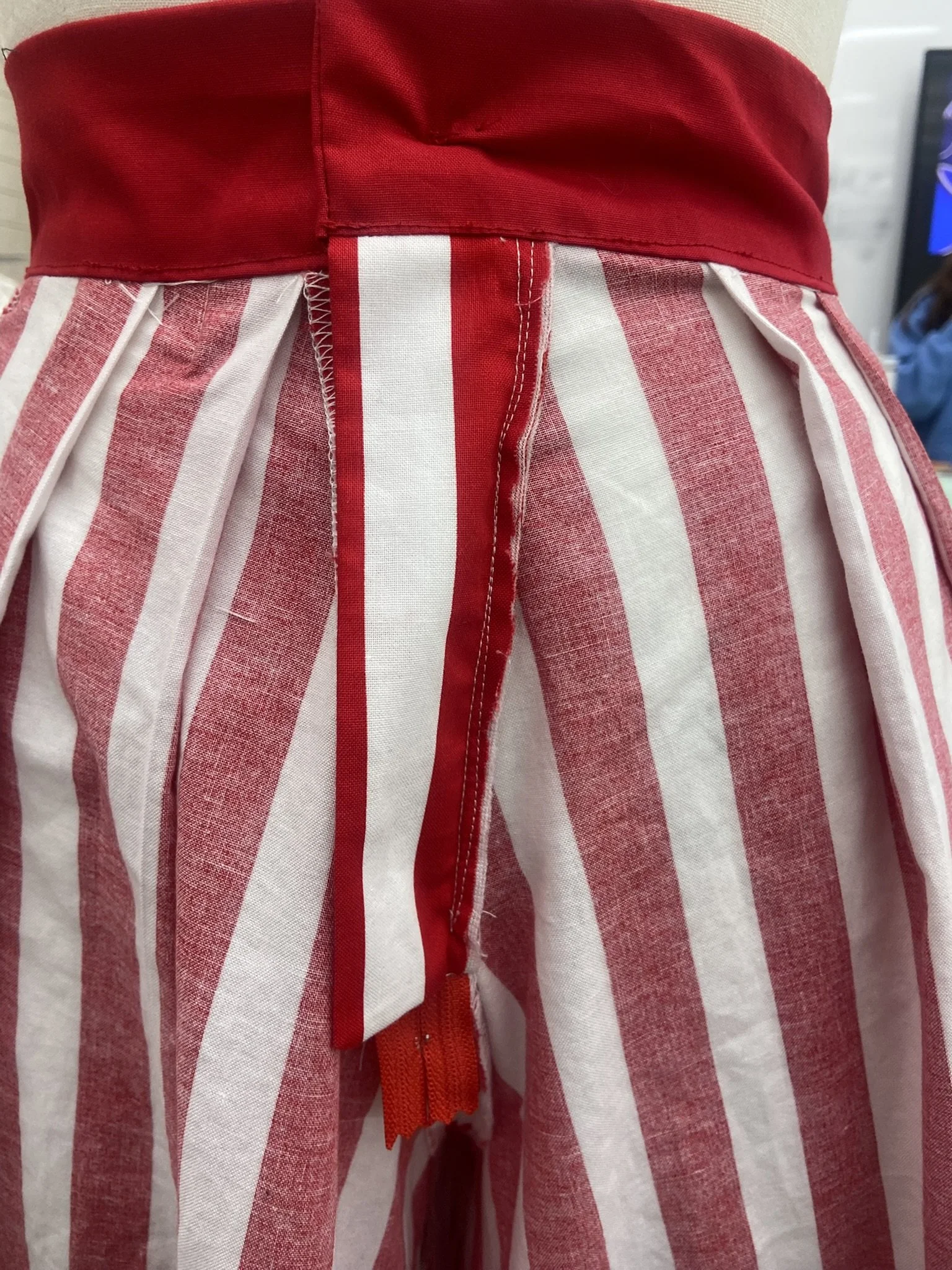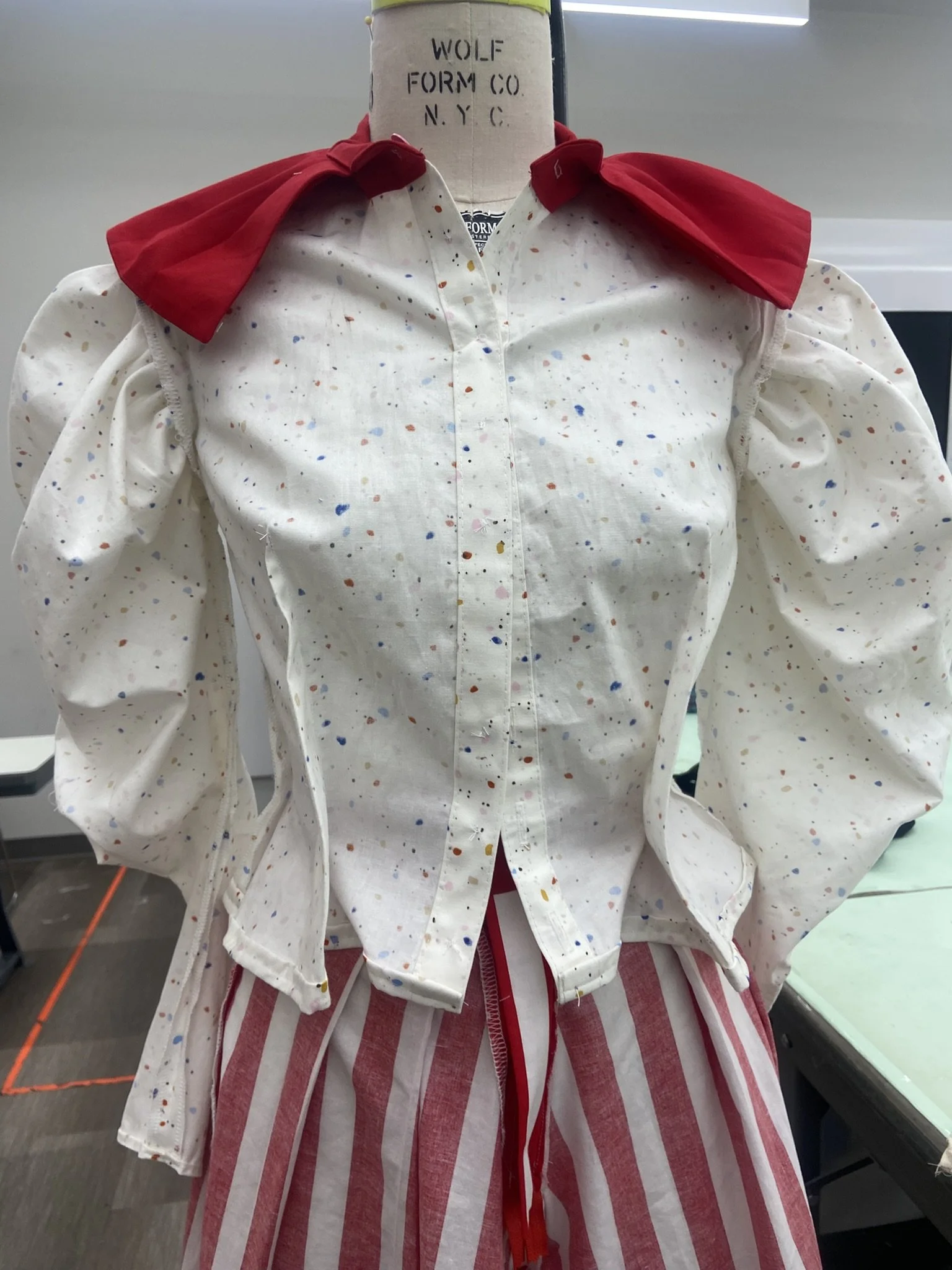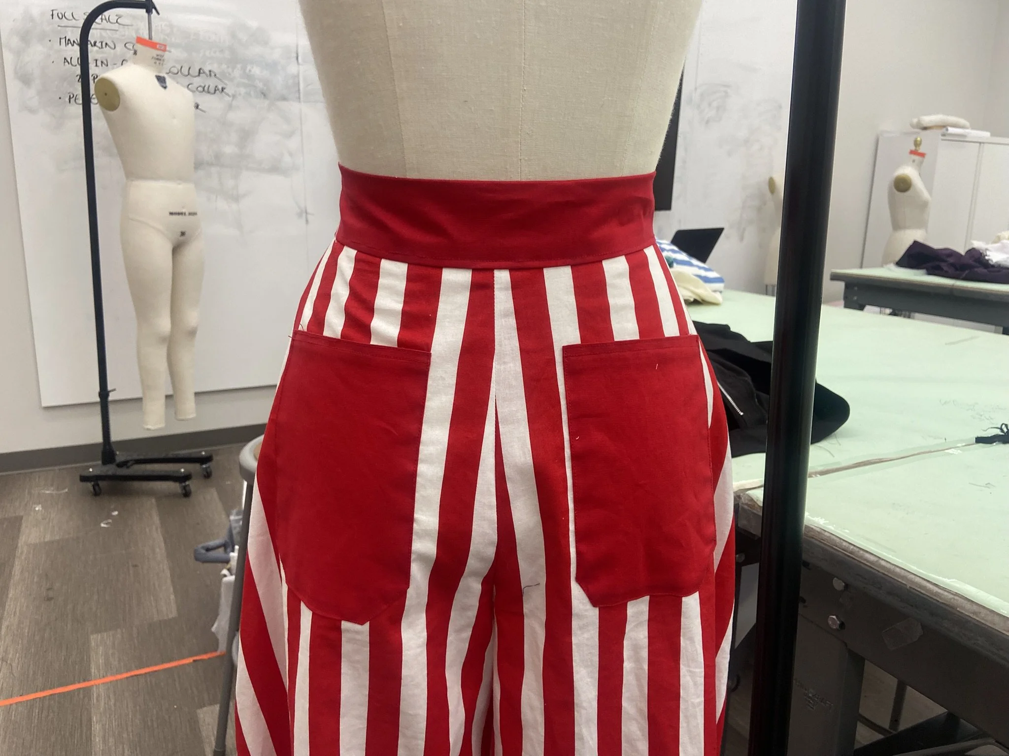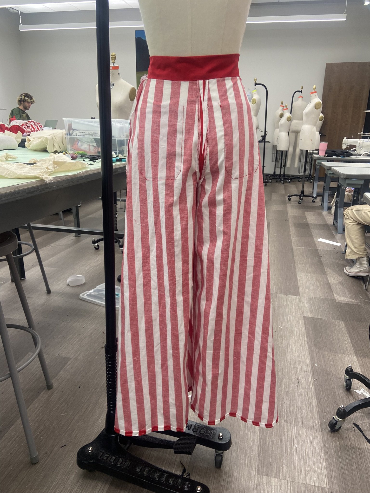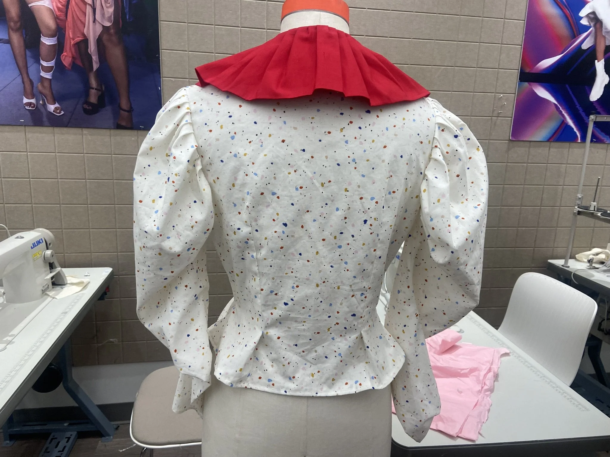 This project was the final for Fash 216, pattern development, which required us to take a garment with specific elements, draft the pattern, and then create a prototype and final outfit. The elements I needed to include were fitted bodice with front and back darts, leg of mutton sleeves, a stand collar with pleats, and flared pants with pleats.